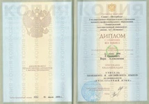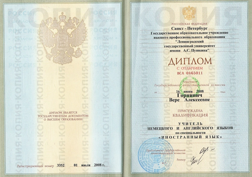 Я выпускница ЛГУ им. А.С. Пушкина, специальность — учитель немецкого и английского языка (2008 год, красный диплом).