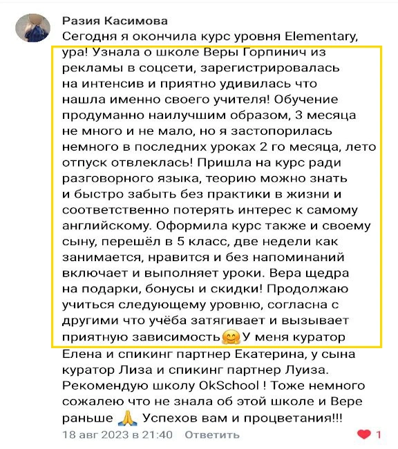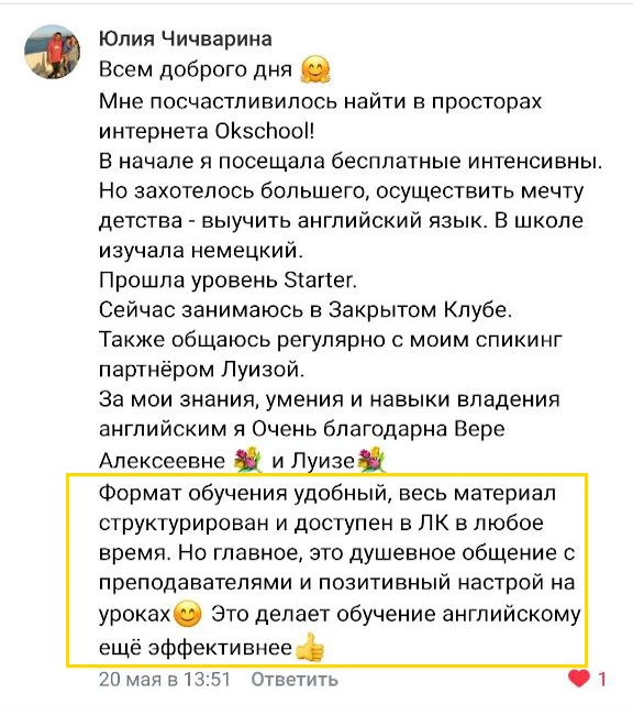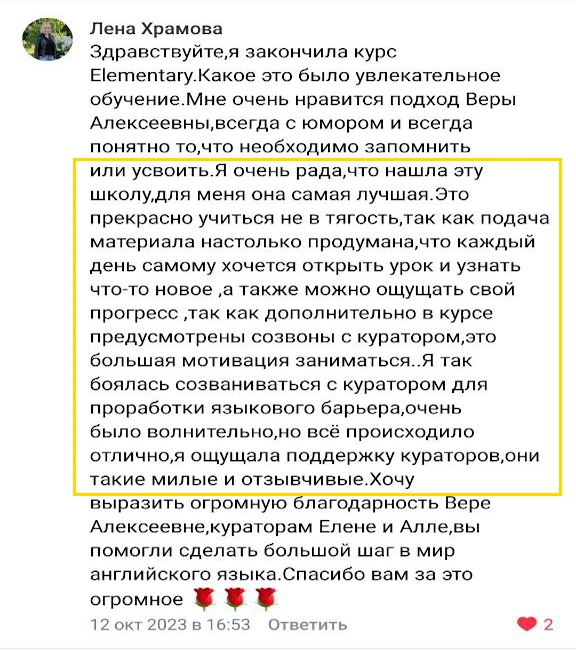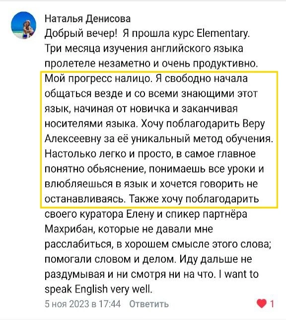 Если вы ещё сомневаетесь в своих силах - просто помните о том, что на курсе предусмотрена тройная гарантия результата с возвратом средств, постоянная обратная связь, поддержка личных преподавателей и закрытый чат для участников. Мы поддерживаем своих учеников, мотивируем их заниматься и с удовольствием наблюдаем их прогресс в языке каждый день